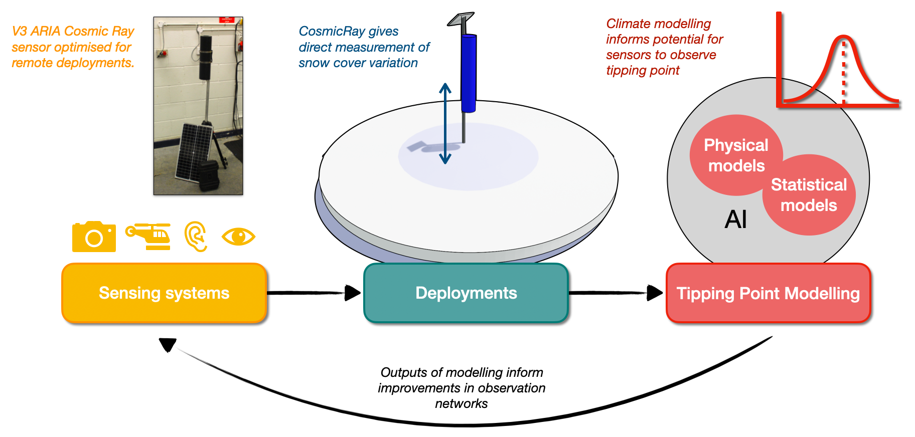 Key components of the ARIA Forecasting Tipping Points program showing how sensor data and deployments will be used to update models and optimise a future observation network. Figure adapted from the ARIA Forecasting Tipping Points programme thesis : Link (Diagram Credit: Matthew Rowe, Patrick Stowell)