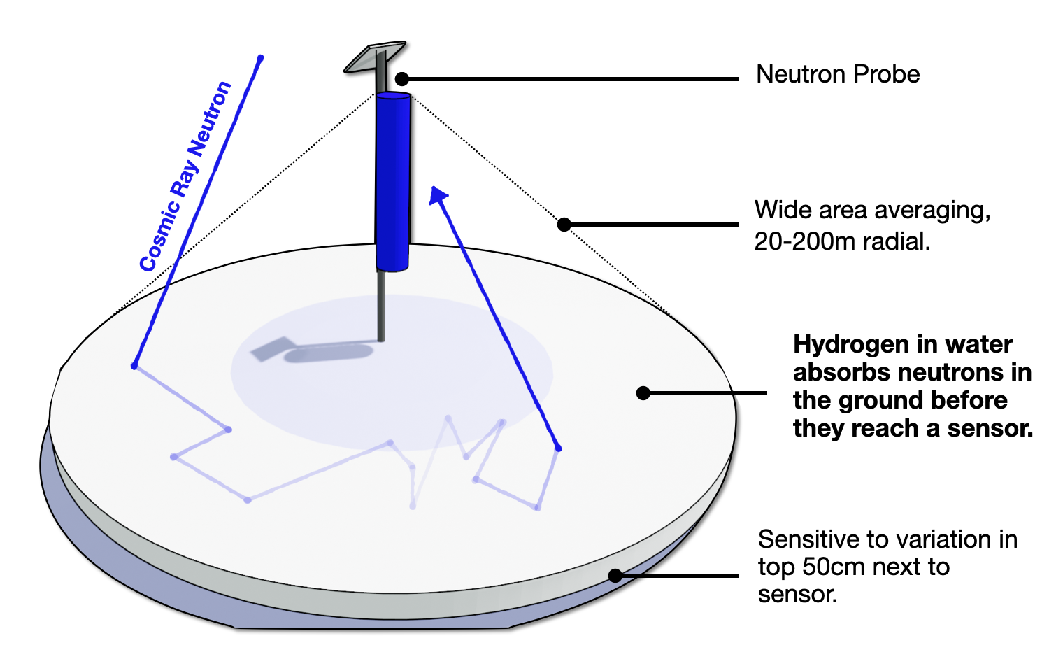 CosmicRay makes use of one specific type of cosmic ray particle, neutrons, to remotely sense the world around us. Since these neutrons have a high chance of interacting with hydrogen, when water or snow cover increases around a sensor, it leads to less neutrons being detected above ground.